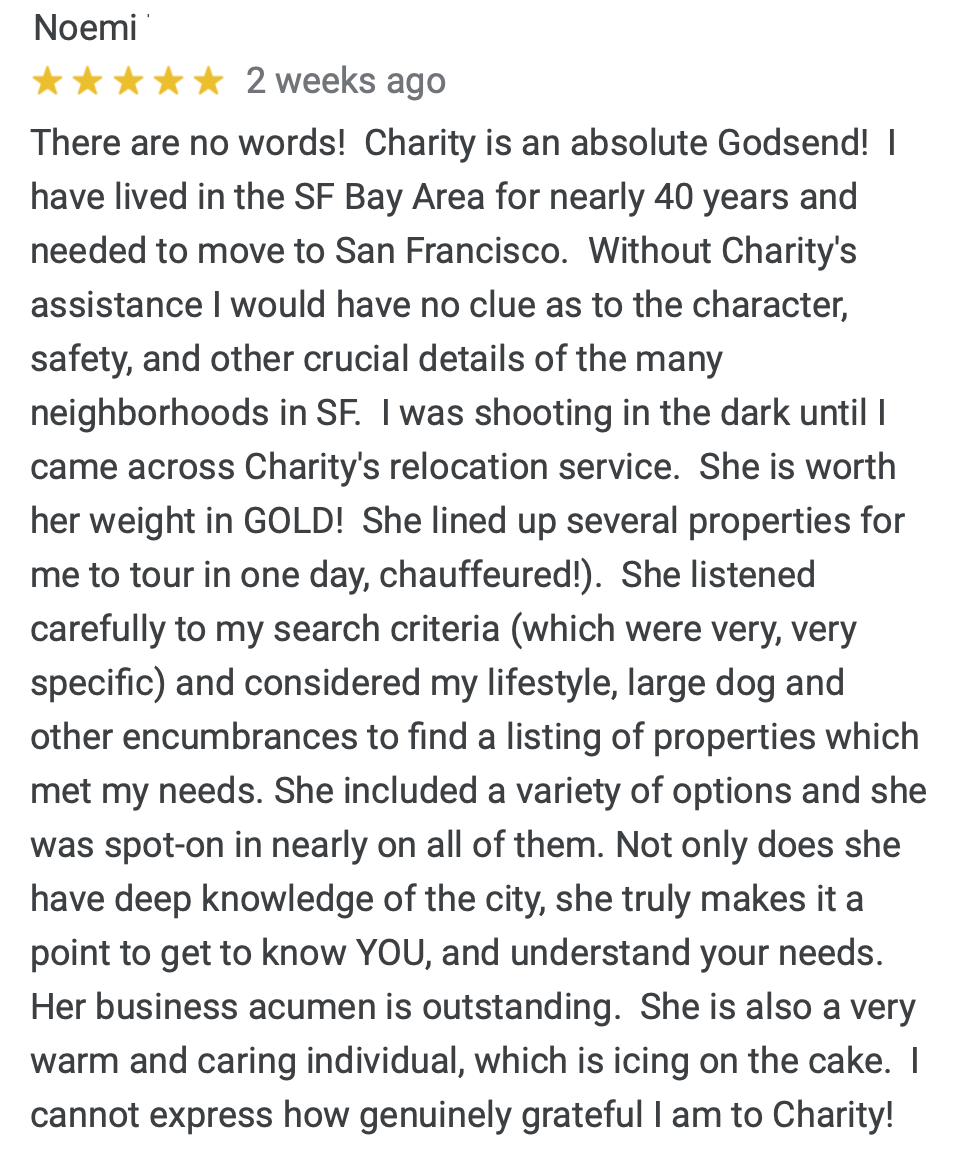 "Back in June, I made the move from Los Angeles to San Francisco for a new job. I had a rough idea of a few neighborhoods I might want to live in, but that was about it. Charity set me up with a day full of appointments -- 12 in all! I walked myself around to all of them, but Charity prepped me on questions I should ask, what to look for, and what the appropriate price ranges should be for the amenities included with each. After my tiring day, I ended up applying to 3, got accepted to 2, and decided on the perfect place in Pacific Heights.